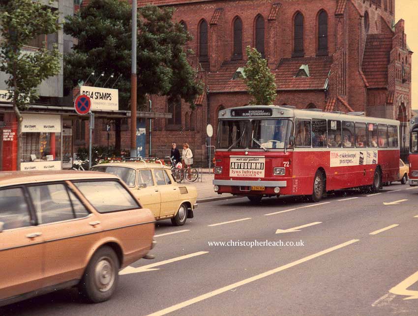 Odense on the Island of Fyn is the fourth largest town in Denmark and birhplace to the most famous Dane Hans Christian Anderson. In the Eighties the Municipal bus fleet seemed to consist of Aabenraa bodied Volvo buses and No.72 was of an older type.
