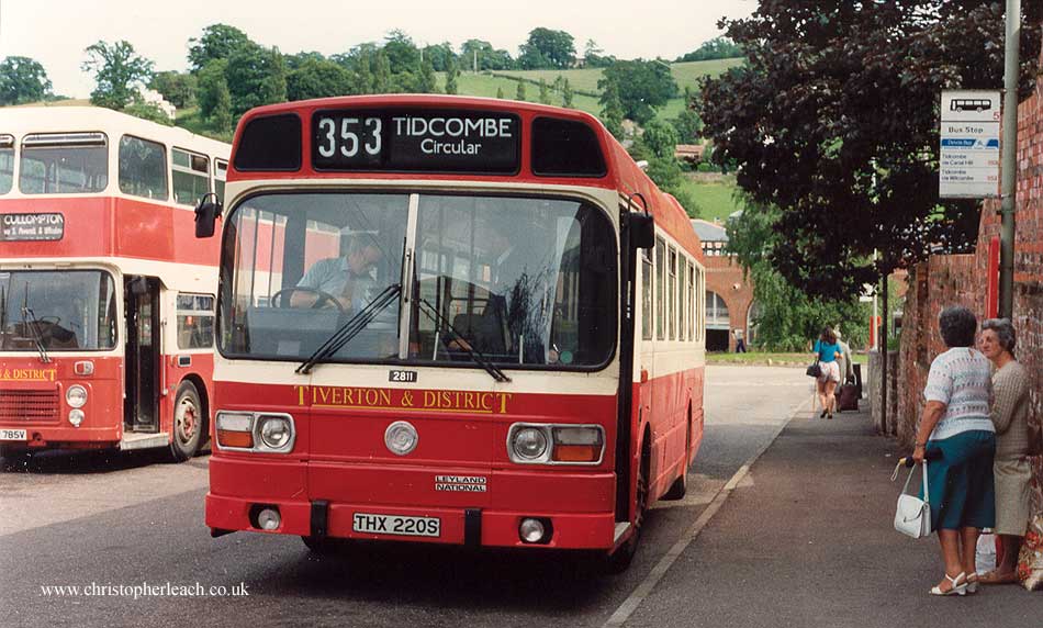 It would be interesting to see how a Leyland National looks in the pre-NBC colours of some BET Gtoup members like PMT or Yorkshire Traction. Well you couldn't do much better than take a look at this former London Transport Leyland National in service with the Tiverton and District operation of Red Bus in Devon. Red Bus in turn was a subsidiary of the privitised Southern National hence the former SN Bristol VR in the background and cast metal fleet numbers were carried too, a practice that had gone on since before the Second World War with Southern and Western National. Even if one wasn't aware that Tiverton and District was part of a larger group the high fleet-number of 2811 was a bit of a give-away as there were no more than 12-15 buses parked in a yard here.
