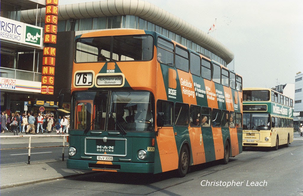 In the same way the red London Transport area contains towns completely surrounded by urban sprawl and suburbia like Croydon and Romford, the same was true of the old West Berlin. The biggest of these is bustling Steglitz and here I photographed one of the better designed of the then prevalent advertising liveries for Bosse on otherwise ubiquitous MAN Wagon-Union 3006 with the bus behind having wrap-round between decks advertising acting like a modified livery..